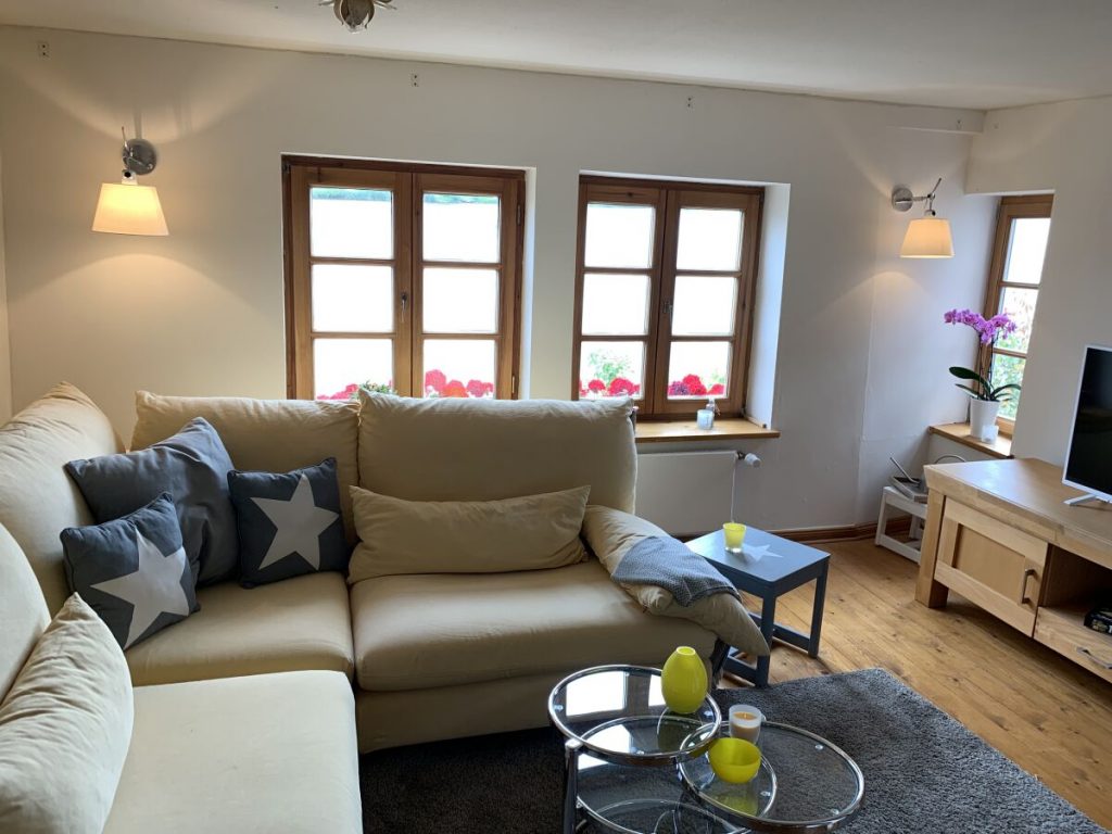 Der Wohnbereich ist der Herzstück des Hauses und verzaubert mit seinem gemütlichen Ambiente. Große Fenster bieten einen traumhaften Ausblick auf die Elbe, den Sie entspannt von der bequemen Couch aus genießen können. Viele unserer Gäste haben den Elbblick als „besser als jedes Fernsehprogramm“ beschrieben. Für gemütliche Stunden steht Ihnen dennoch ein Flachbildfernseher zur Verfügung. Ob ein Buch am Nachmittag oder ein Film am Abend – hier fühlt sich jeder wie zu Hause.