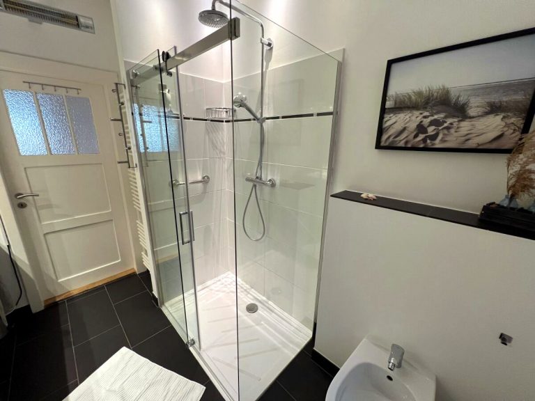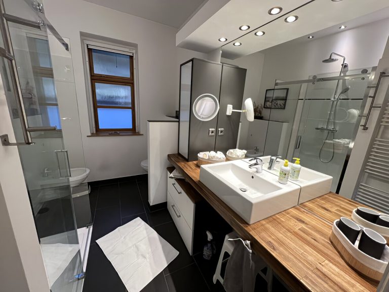 Auch das Badezimmer im Biberloft bietet Ihnen höchsten Komfort. Modern, stilvoll und mit viel Liebe zum Detail eingerichtet, finden Sie hier alles, was Sie für einen entspannten Start in den Tag benötigen. Neben hochwertigen Armaturen und flauschigen Handtüchern sorgt die ebenerdige Regendusche für ein wahres Wellness-Erlebnis. So wird jeder Morgen zu einem erfrischenden Genuss – perfekt, um nach einem langen Tag in der Natur wieder neue Energie zu tanken.